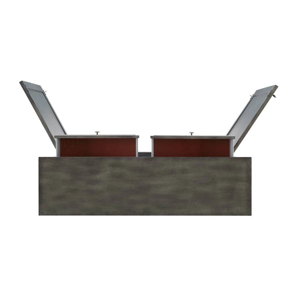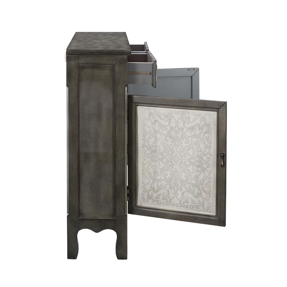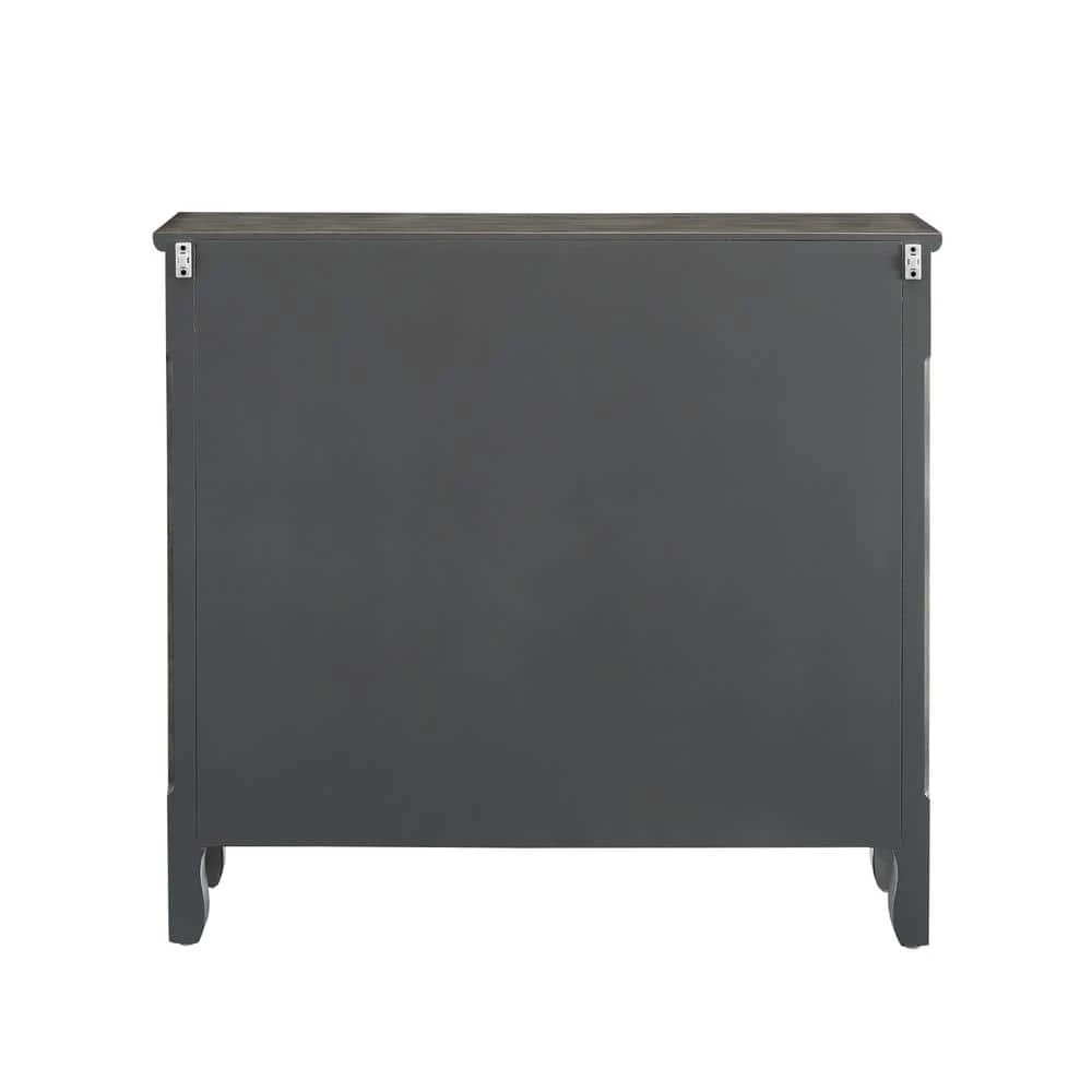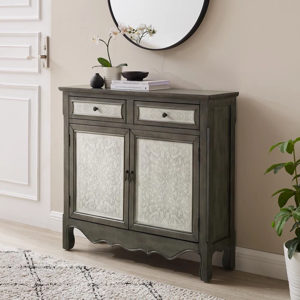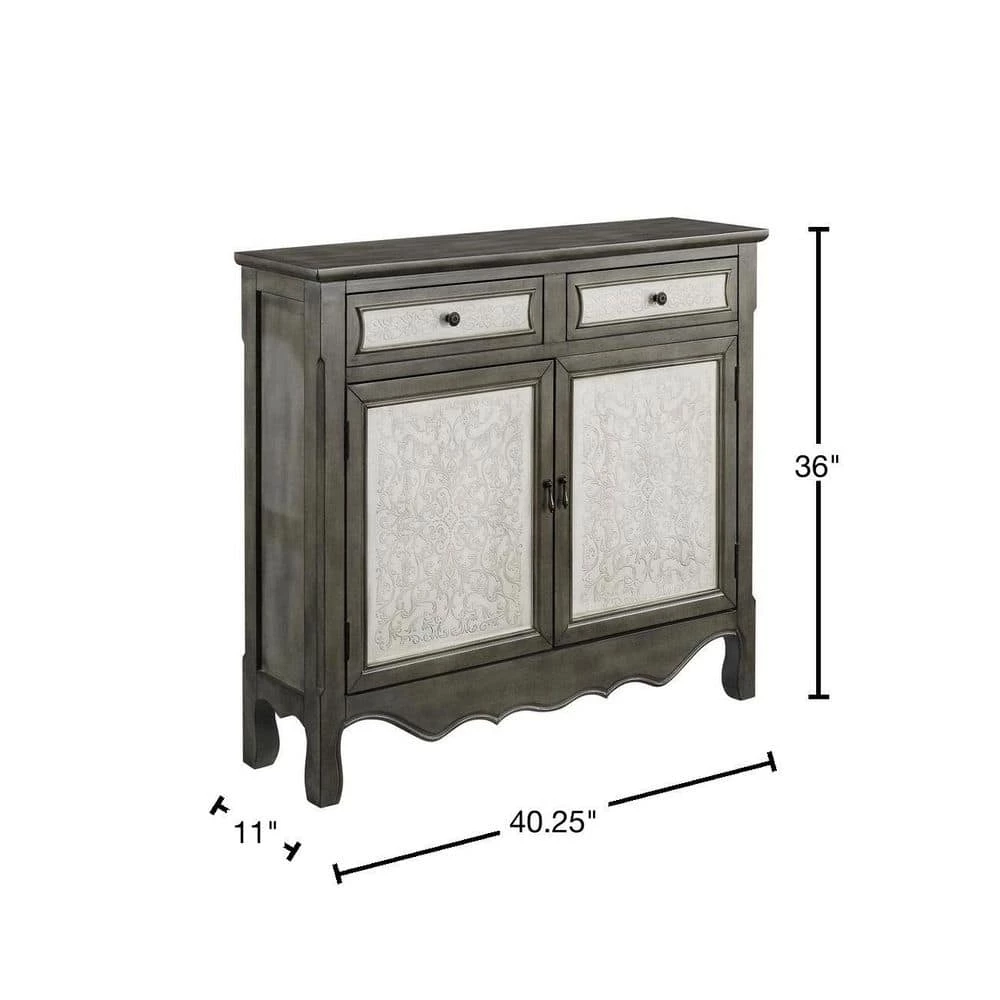 This Paradise 40 in. W Grey 36 in. H Rectangular Wood Console Cabinet with 2-Drawers and Hidden Shelf adds sophistication and class to any room. The decorative curved bottom gives an extra touch of drama to the piece, and white panels with a raised decorative pattern adorn the front. 2-drawers offer space to hide away accessories or keepsakes. The console opens with two doors to reveal storage space with a fixed shelf. This is the perfect piece to add to any entryway, hall, or living area.
