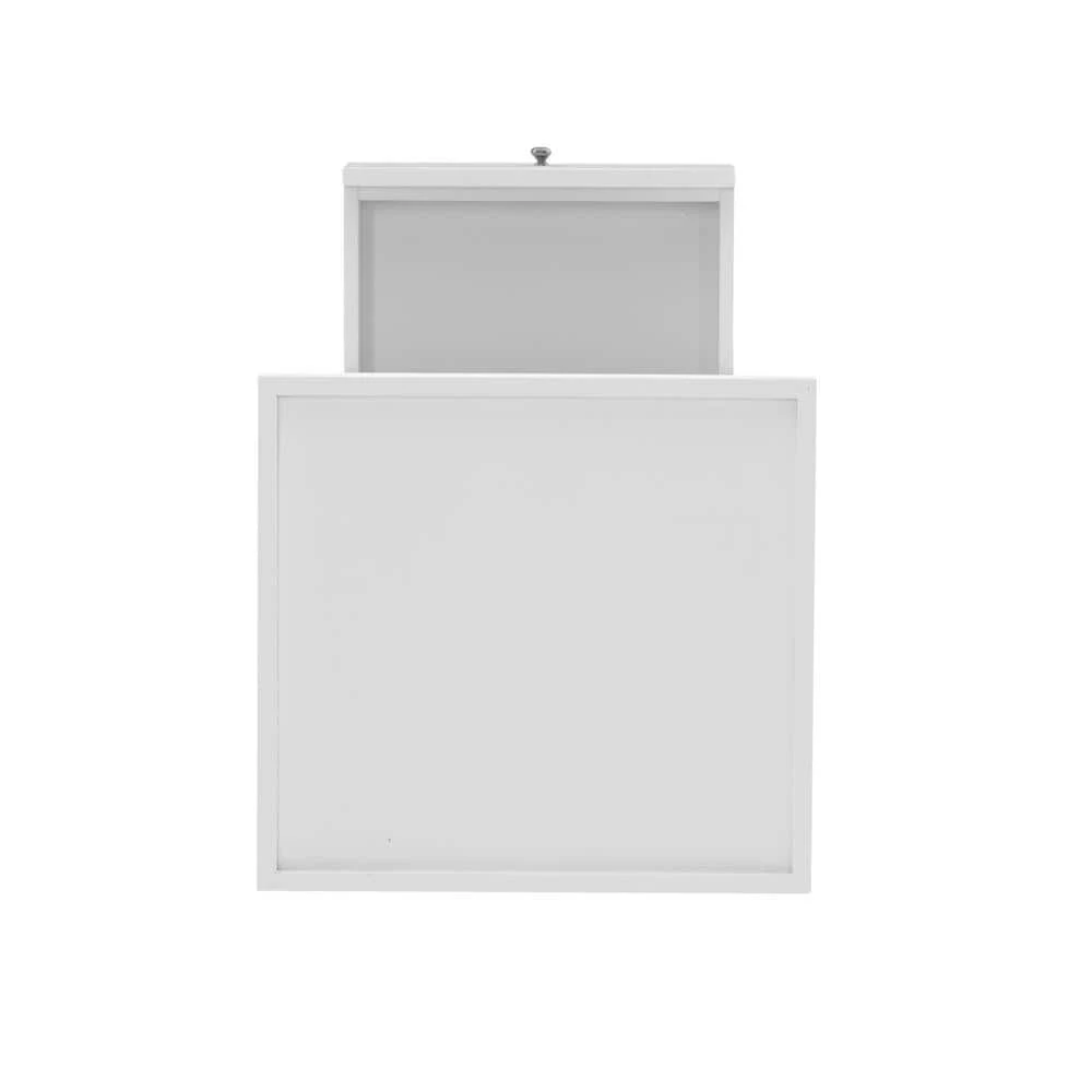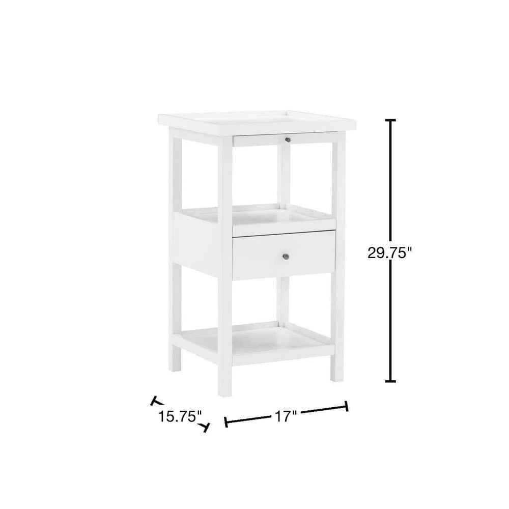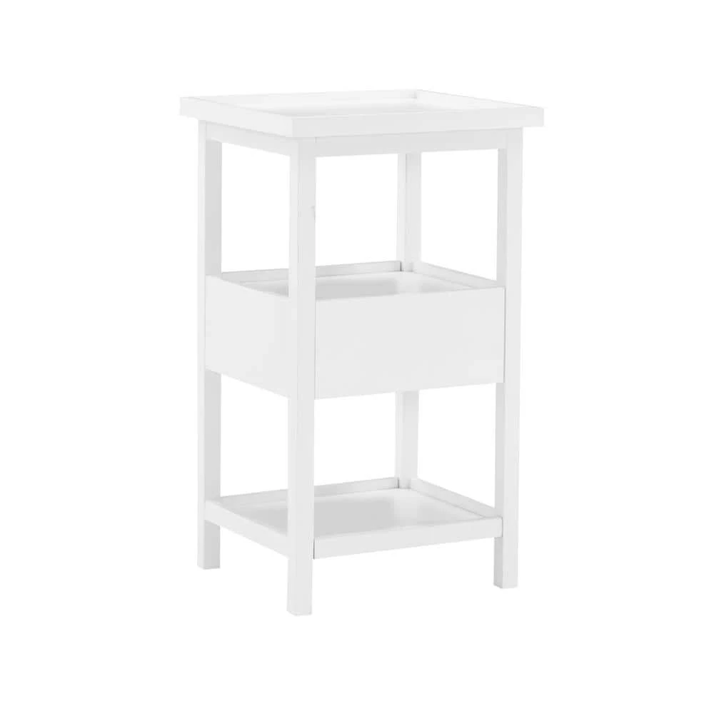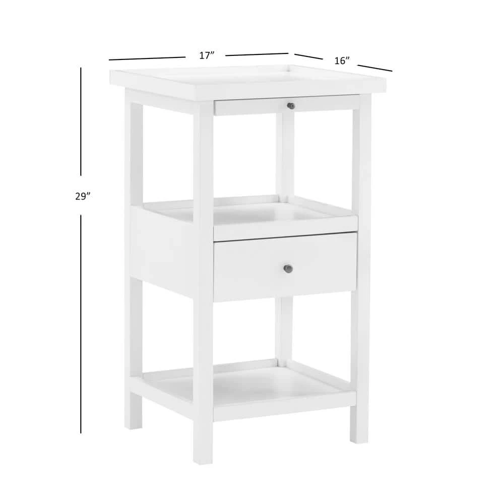 With clean lines and fun colors, this Pintor White Accent Table is the perfect addition to any room. The square shaped tabletop has a raised rim and there is a convenient pull out tray that extends the table top for extra surface space. 2 open shelves flank a drawer that can be used for added storage. White finish with petite oil rubbed bronze knobs.