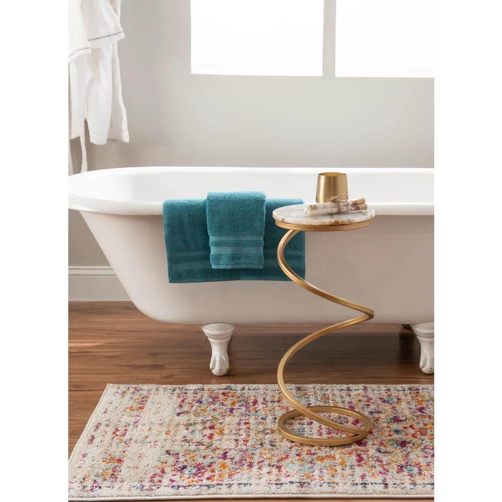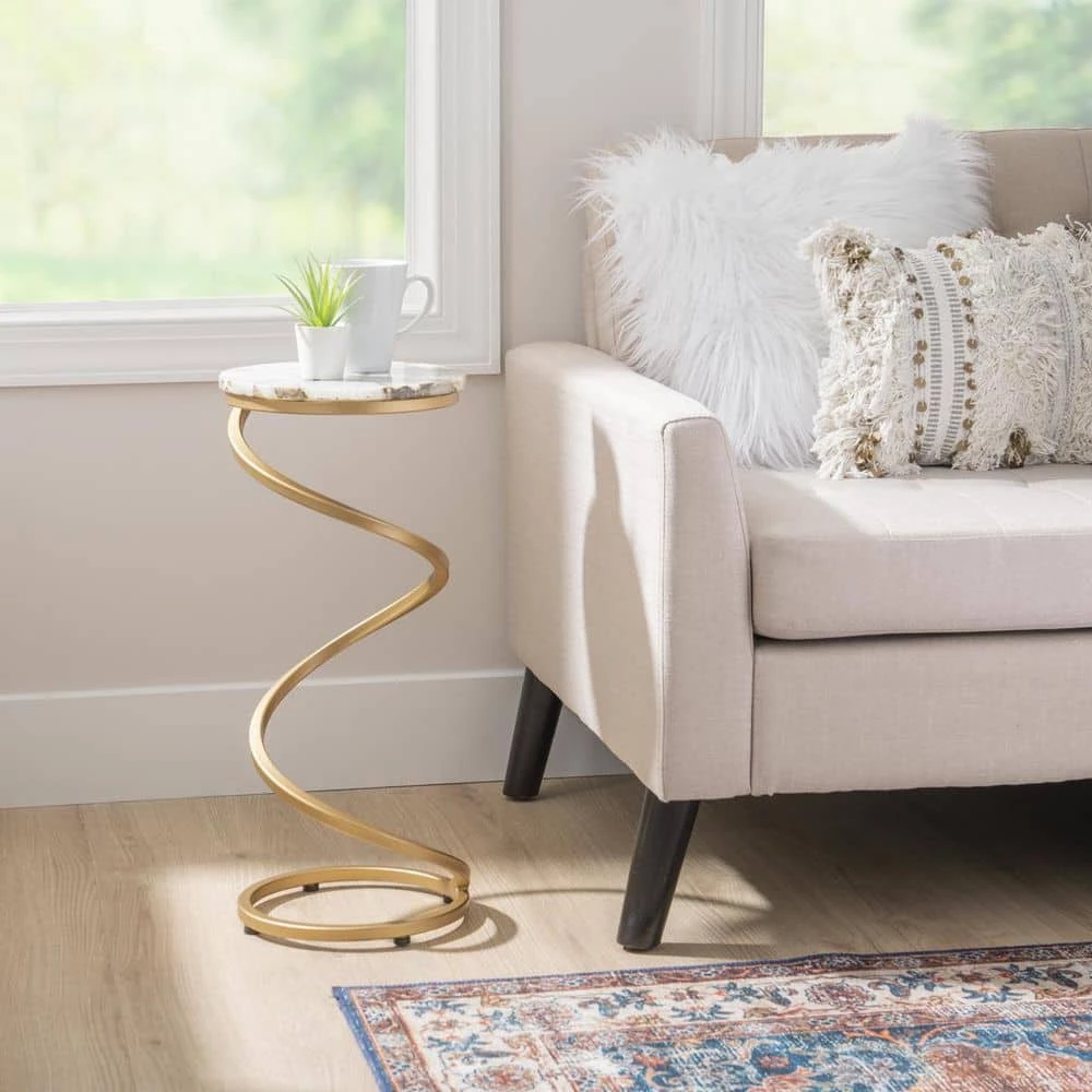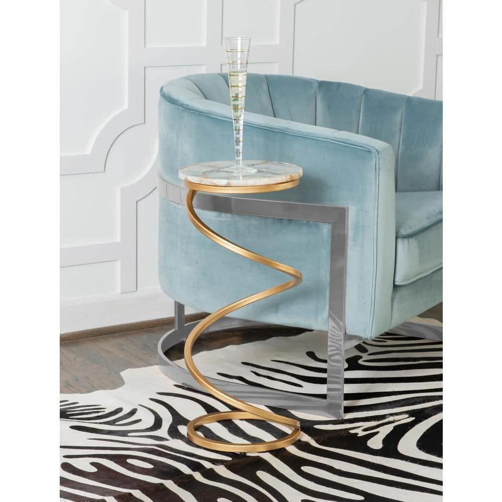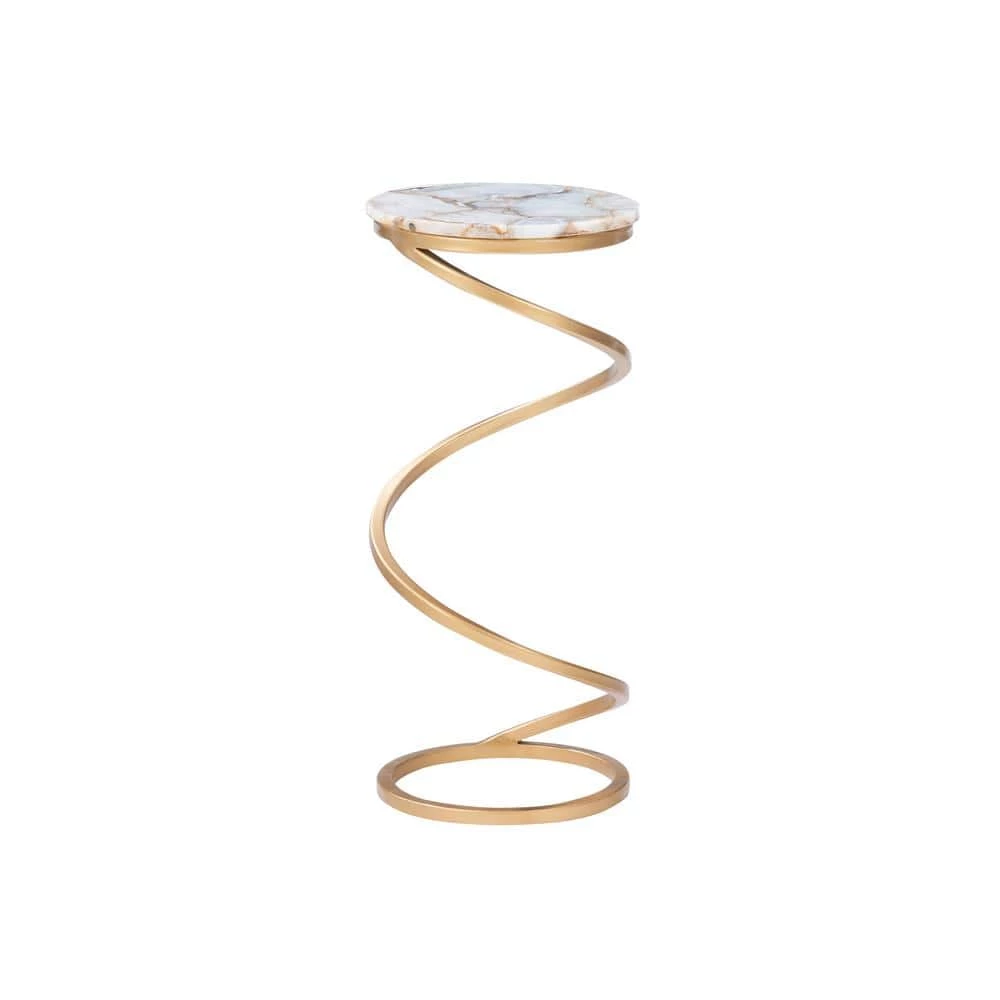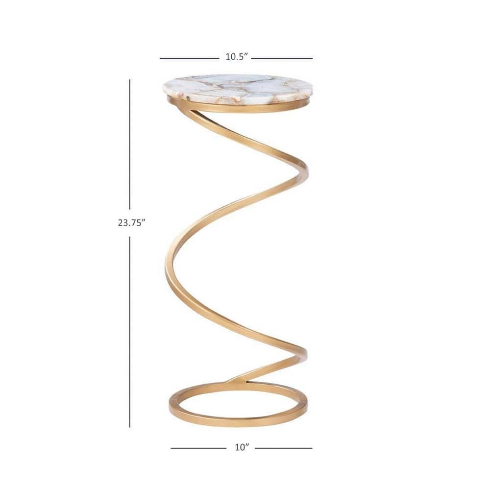 This Pippen Grey Agate and Gold Spiral Drink Table can do more than hold beverages. This fanciful table looks lovely sitting solo or set alongside a sofa. The flowing lines allow surrounding accents to breathe, while the gold finish completes the look. A 10.5 in. round grey agate top provides a perfect stage for drinks, candy dishes, framed photos and beyond. Levelers under the round iron base ensure a stable surface to keep your belongings safe. The compact size allows the table to be effortlessly placed where it’s needed most.