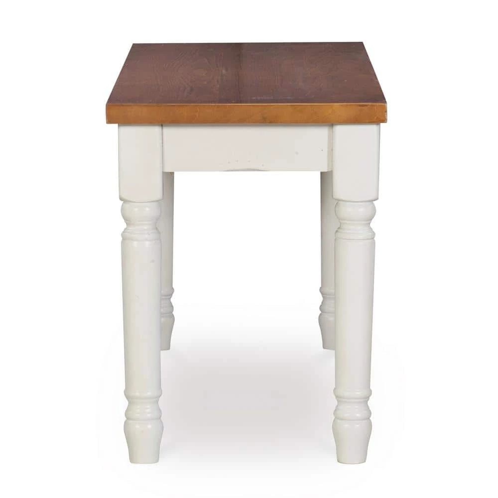 Warm, casual farmhouse combination of honey brown top with a vanilla white foundation come together to create this bench that is ready for fine dining or adding extra seating anywhere in your home. Multi step glaze on seat brings out the grain of this oak wood veneer. Sculpted, turned legs with glaze finish add a farmhouse touch. Solid wood construction is built to last. Not just for dining, this bench can also be used in your entryway, mudroom or even at the foot of your bed.