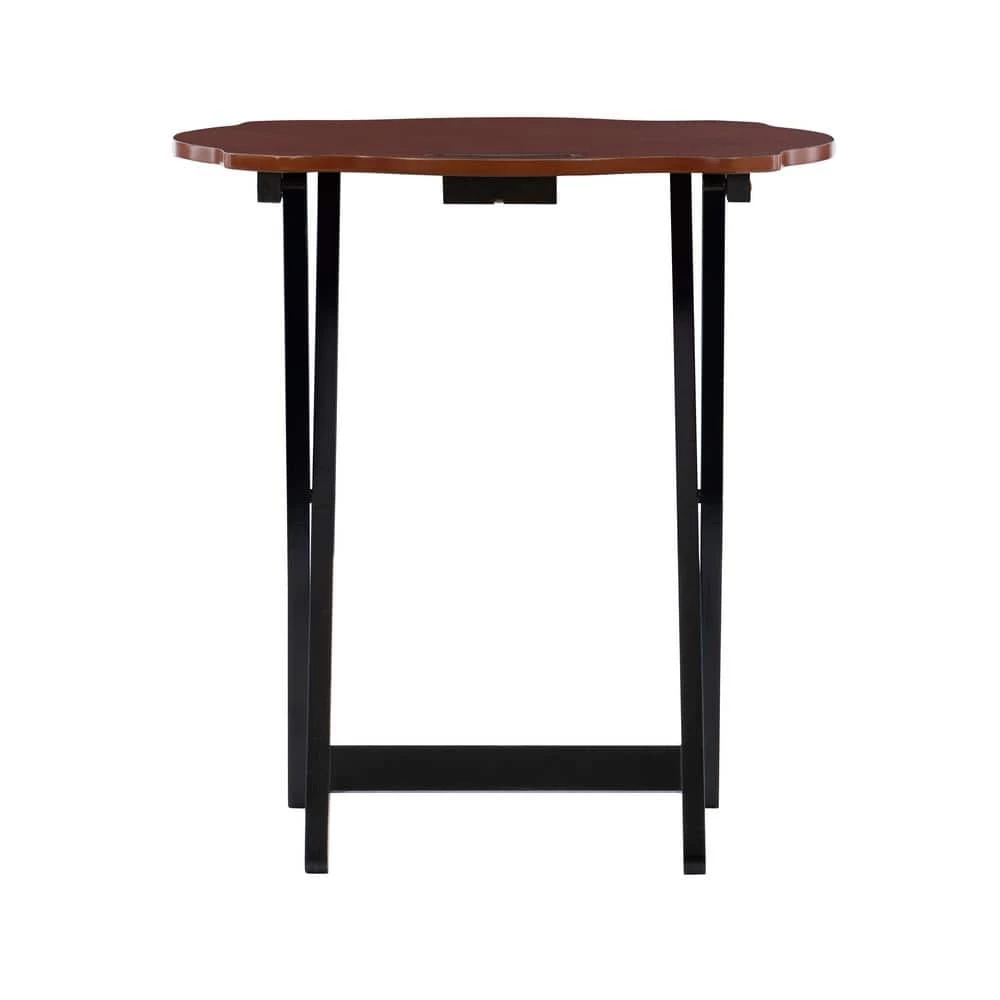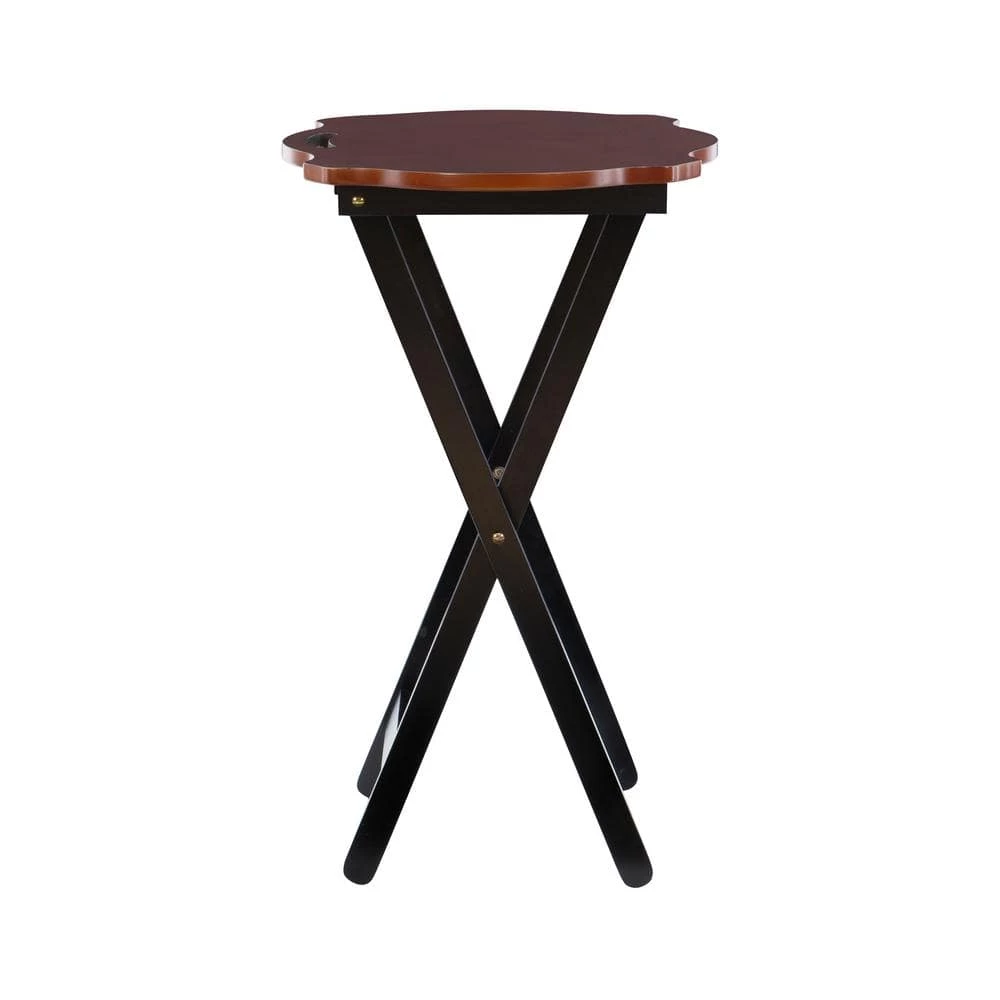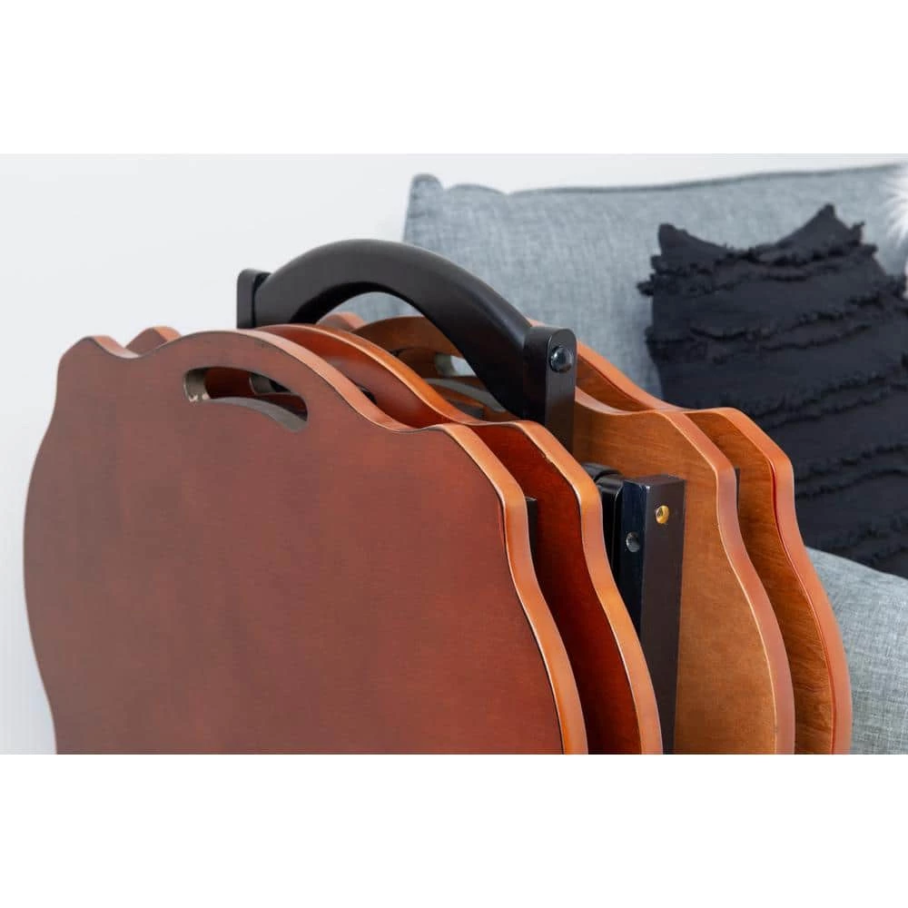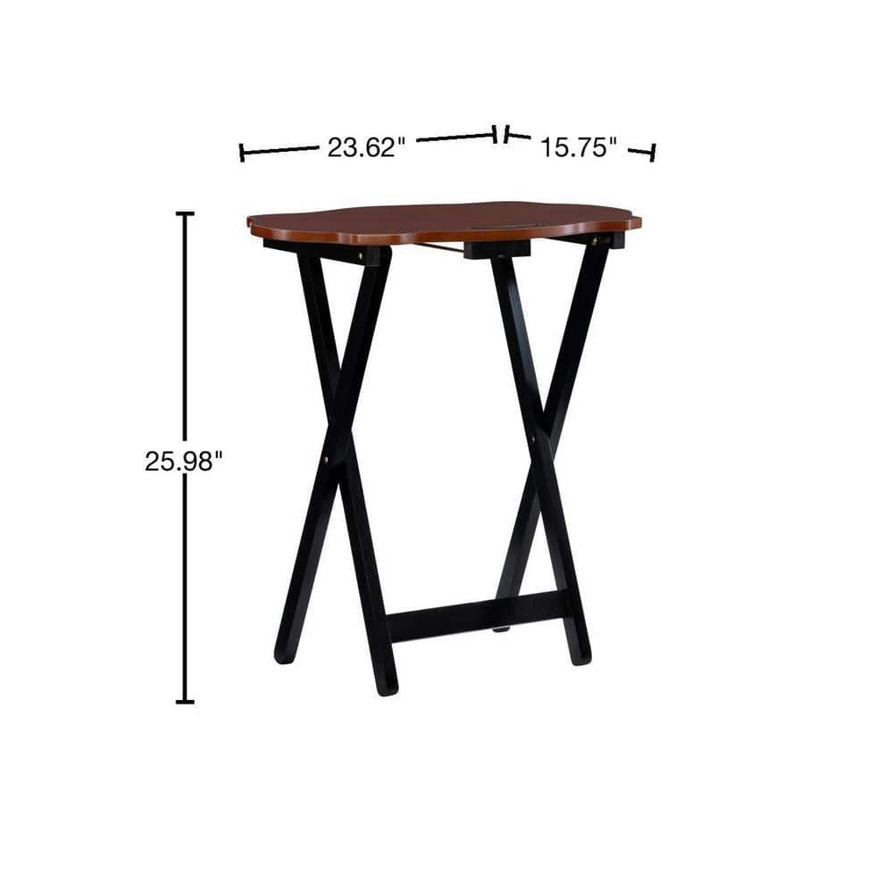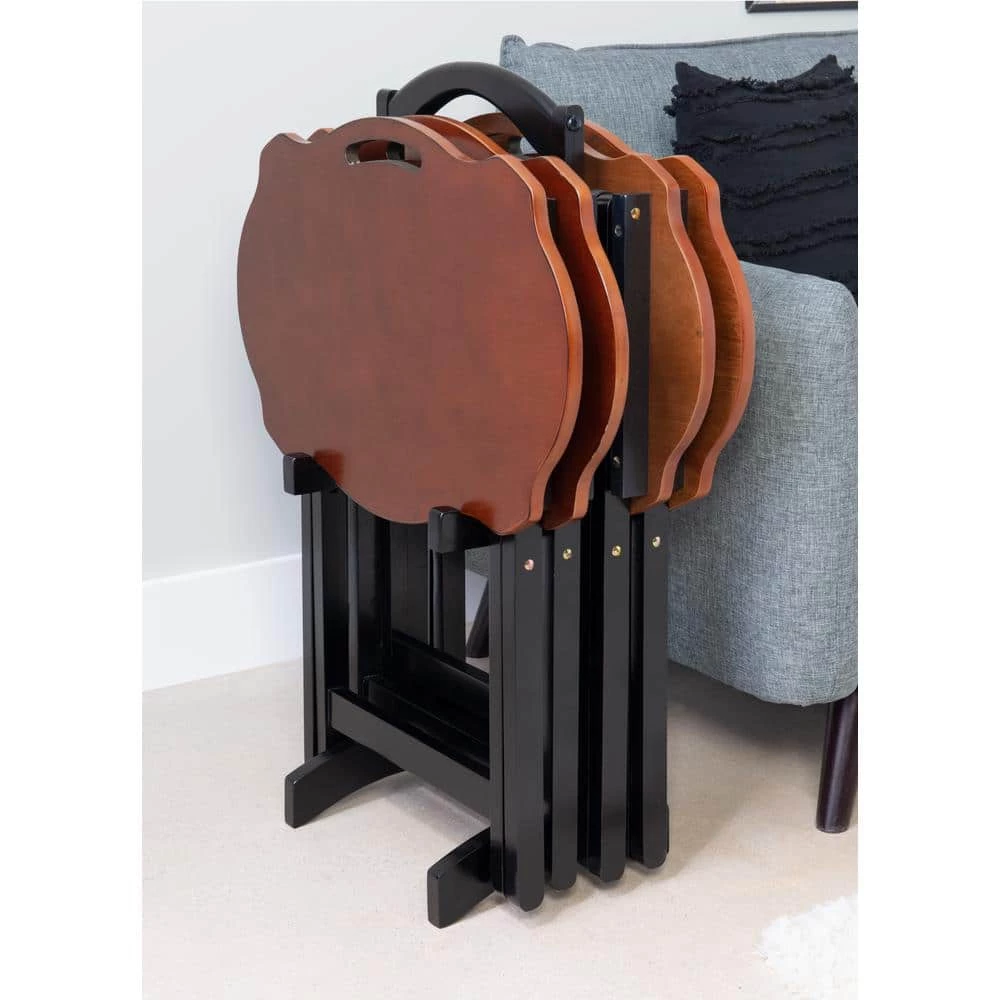 Perfectly suited for function and looks, the Serpentine Black Tray Tables are a modern take on household staple. The tabletop is a unique serpentine shape and the wood stand provides easy storage options. Both the tables and the stand have wood handles for portability. With hazelnut tabletops and a contrasting sleek, black base, this set will fit in easily with your home decor.