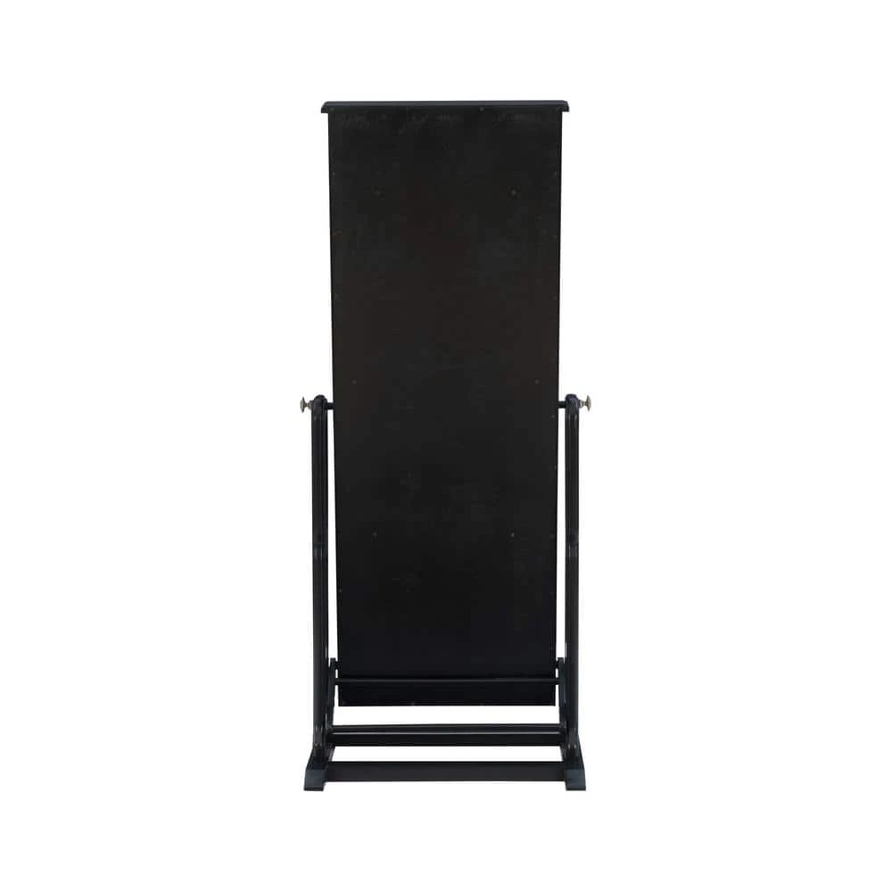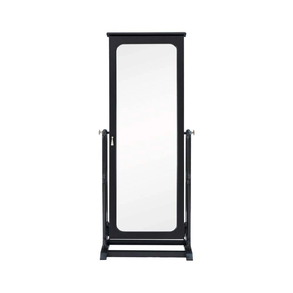 The Sirena Black features a full length adjustable mirror that opens to reveal deep luxurious, brown lined jewelry storage compartments. The full length mirror adjusts to 3 different angles for dressing or grooming. Convenient jewelry storage for rings, earrings, bracelets, broaches, and accessories. Finished in rich “Antique Black” with “Antique Brass” finish hooks that are ideal for necklaces and chains. Shiny Chrome exterior mirror knobs for adjustments. Some assembly required.