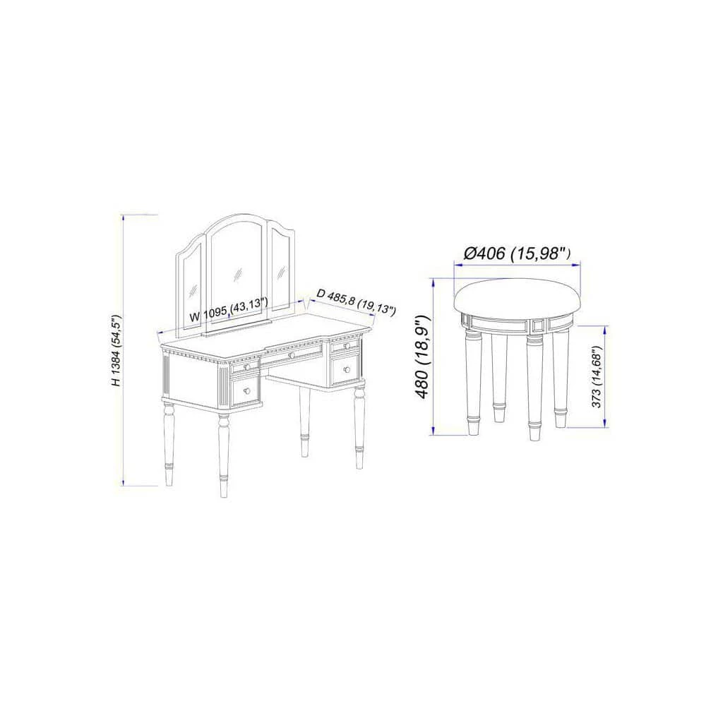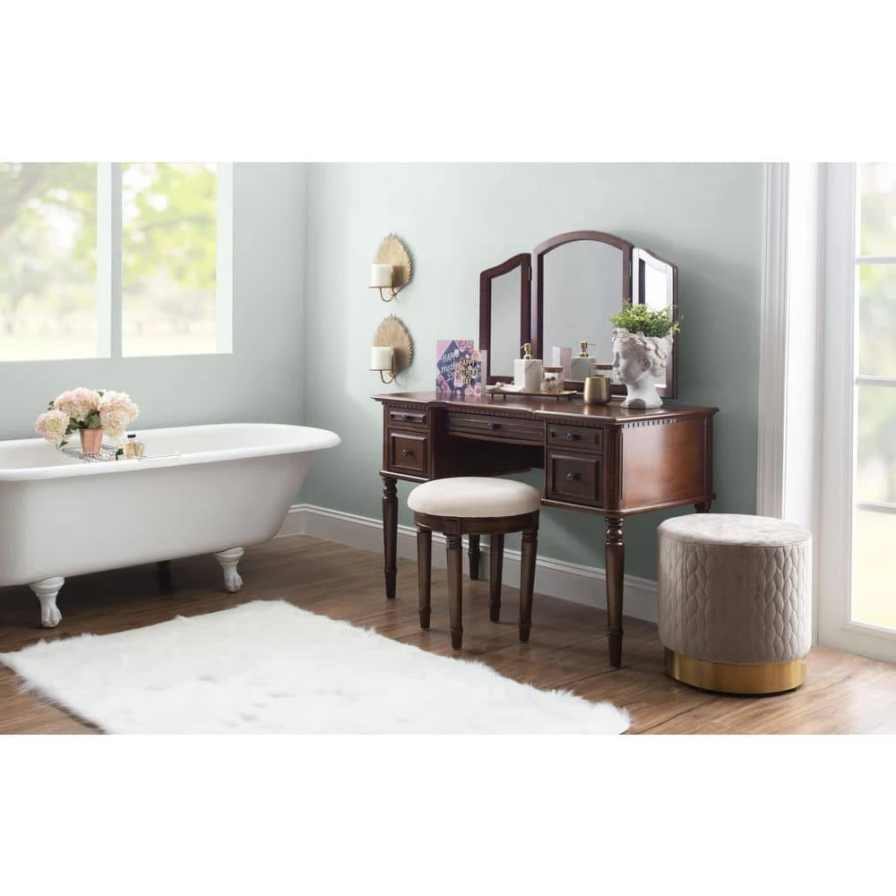 The Vogt Vanity is beautifully styled with tri-fold mirror and round stool is constructed of solid wood and rich cherry veneers. The finish is “Warm Cherry”. The dentil molding frame on underside edge of top is accented with five working drawers that rest on gently turned spindle legs. There are fluted and raised columns. Raised frames on drawer faces have decorative Antique Brass knobs. The round stool has turned spindle legs and a thickly upholstered beige fabric cushion, 63% cotton and 37% polyester. Vanity has leg and mirror assembly. Bench has leg assembly.
