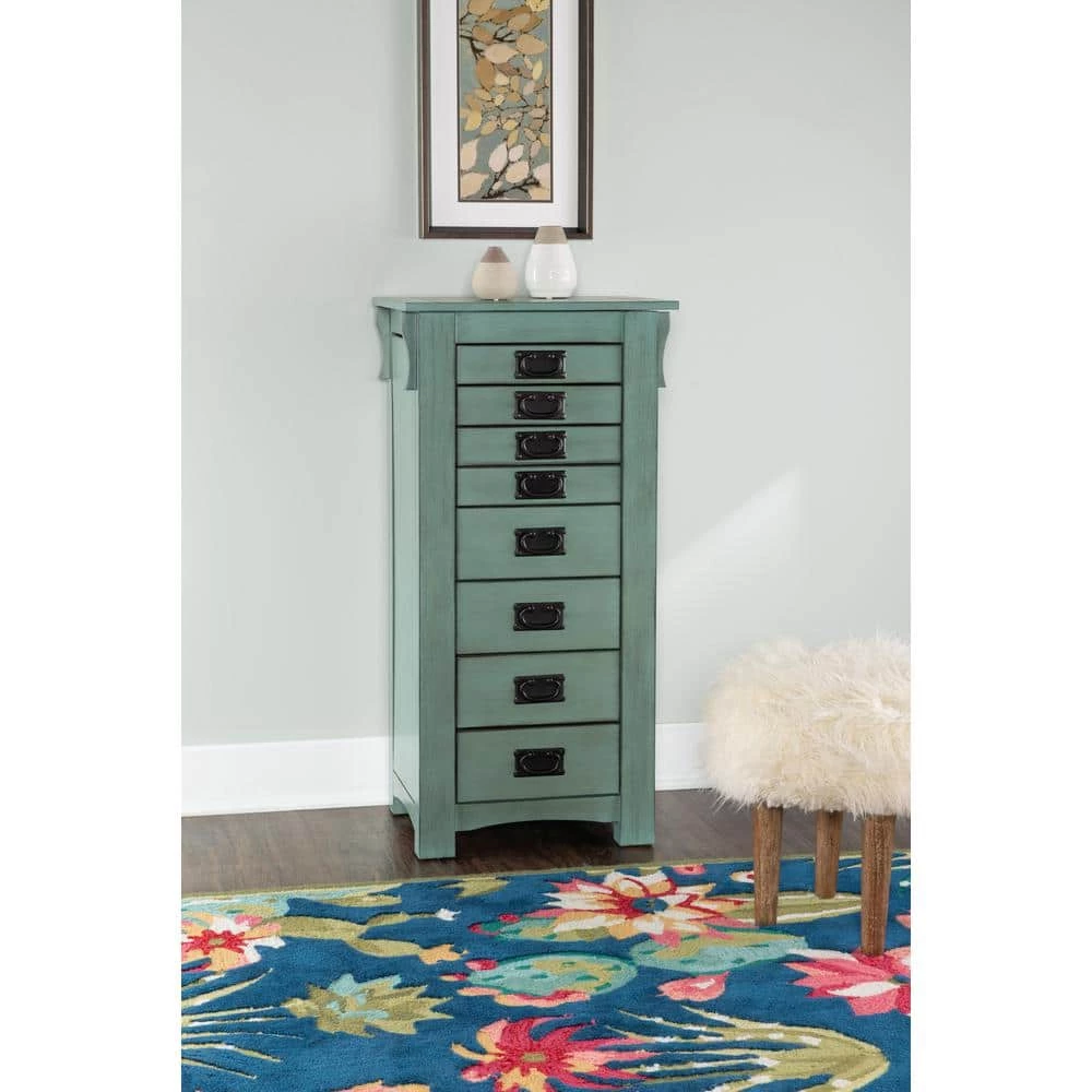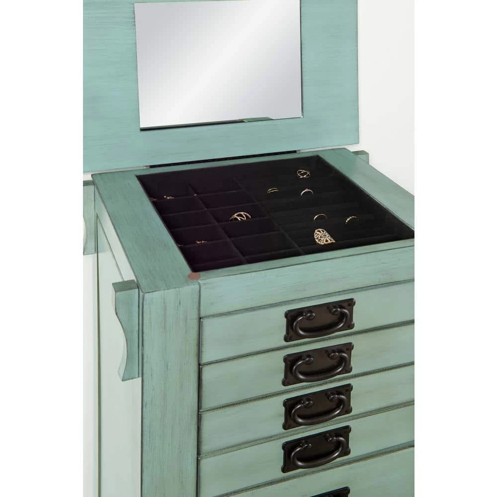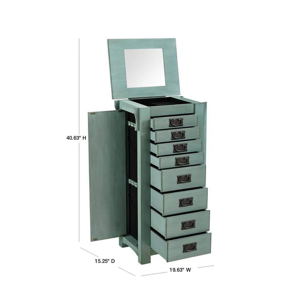 The Wagner Jewelry Armoire in teal is a mission style, classic looking armoire made out of oak veneer. Equipped with 8 drawers/compartments, 2 doors, 14 ring holders, 16 necklace hooks and an interior black lining. Enough room to store all of your most valuables.