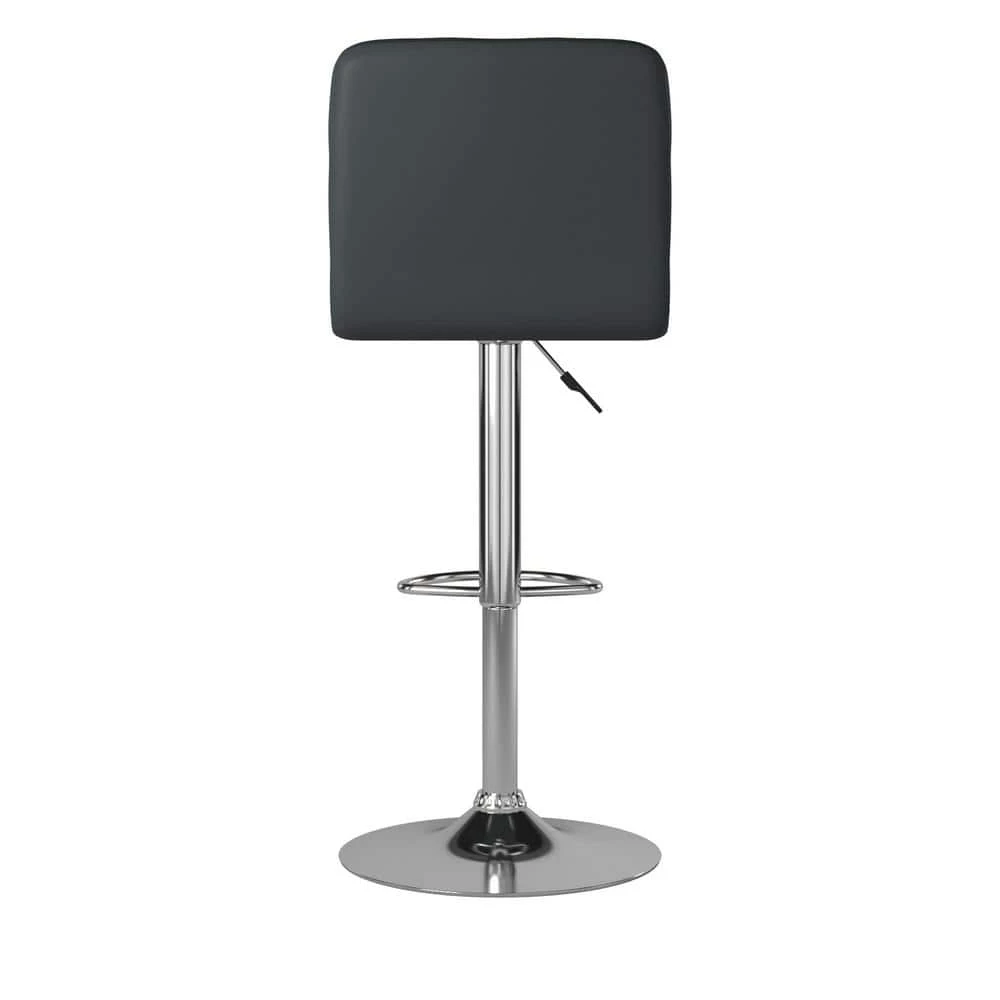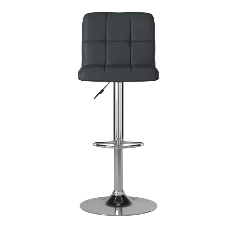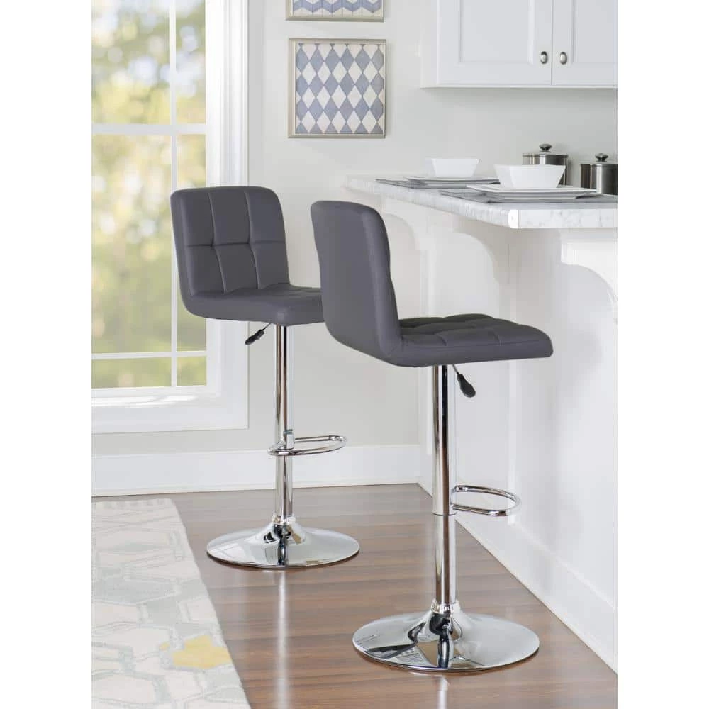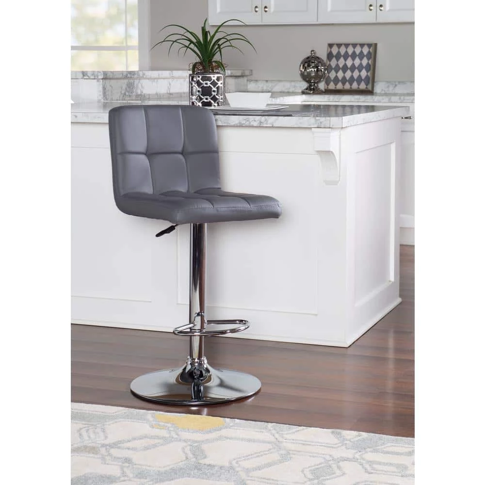 A stylish, faux leather quilted seat lends itself to the contemporary styling of this grey swivel bar stool. Finished with a round sturdy footrest and a gas-lift mechanism for convenient height adjusting, this piece combines function, comfort and style. 225 pound weight capacity.