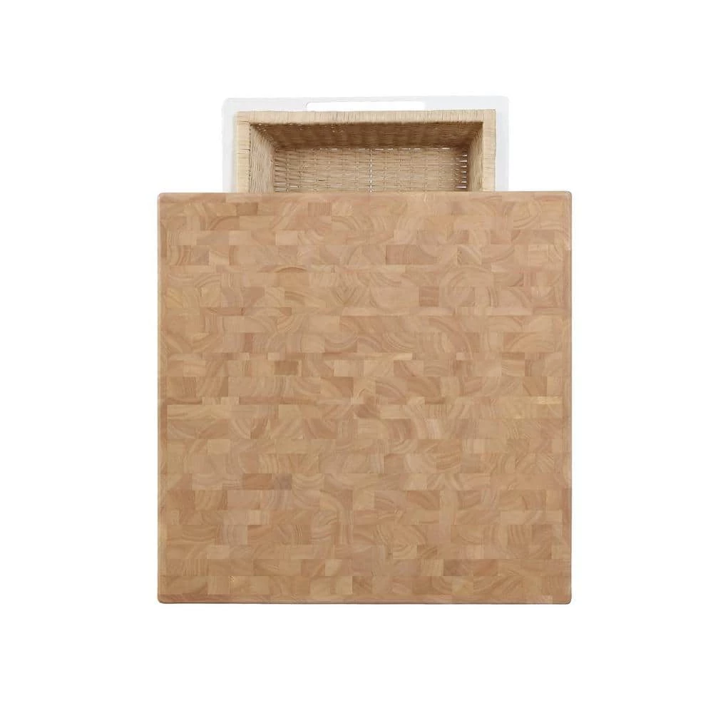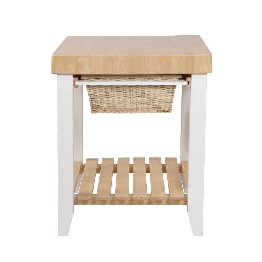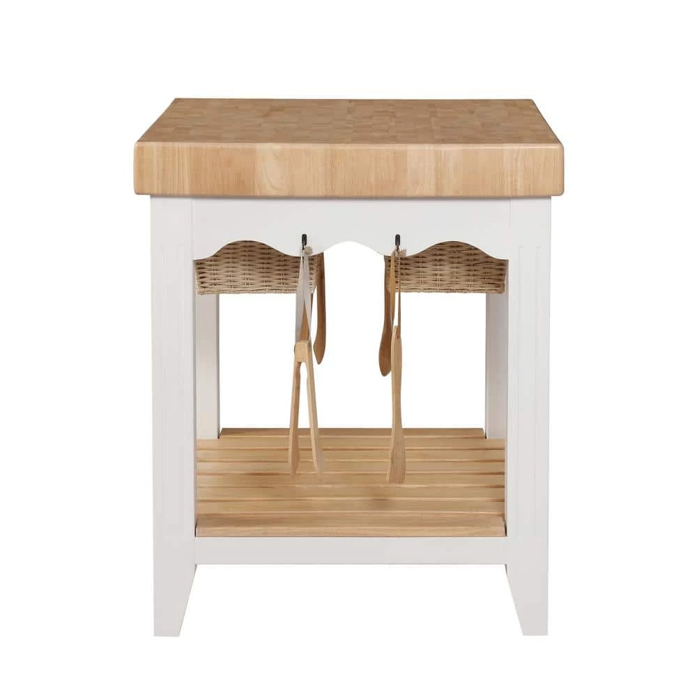 A square kitchen island that is your kitchen storage and food preparation center essential for gourmet food preparation with butcher block top, 2 basket pull out drawers, slat easy access storage base shelf, 4 utensil hooks, and adjustable glides. Includes accessory kit containing spoon, spatula and tongs. Finished in White. Some assembly required.
